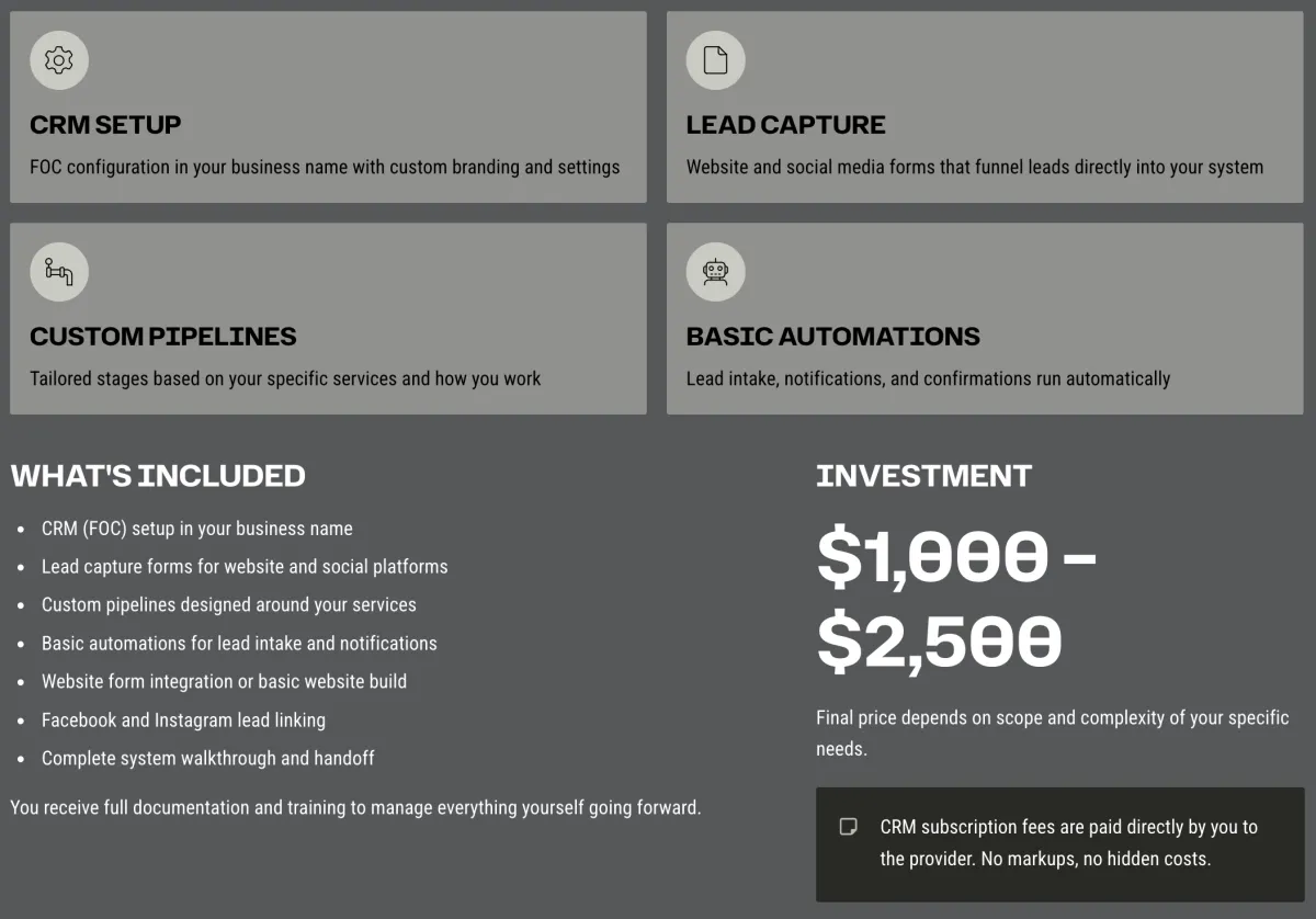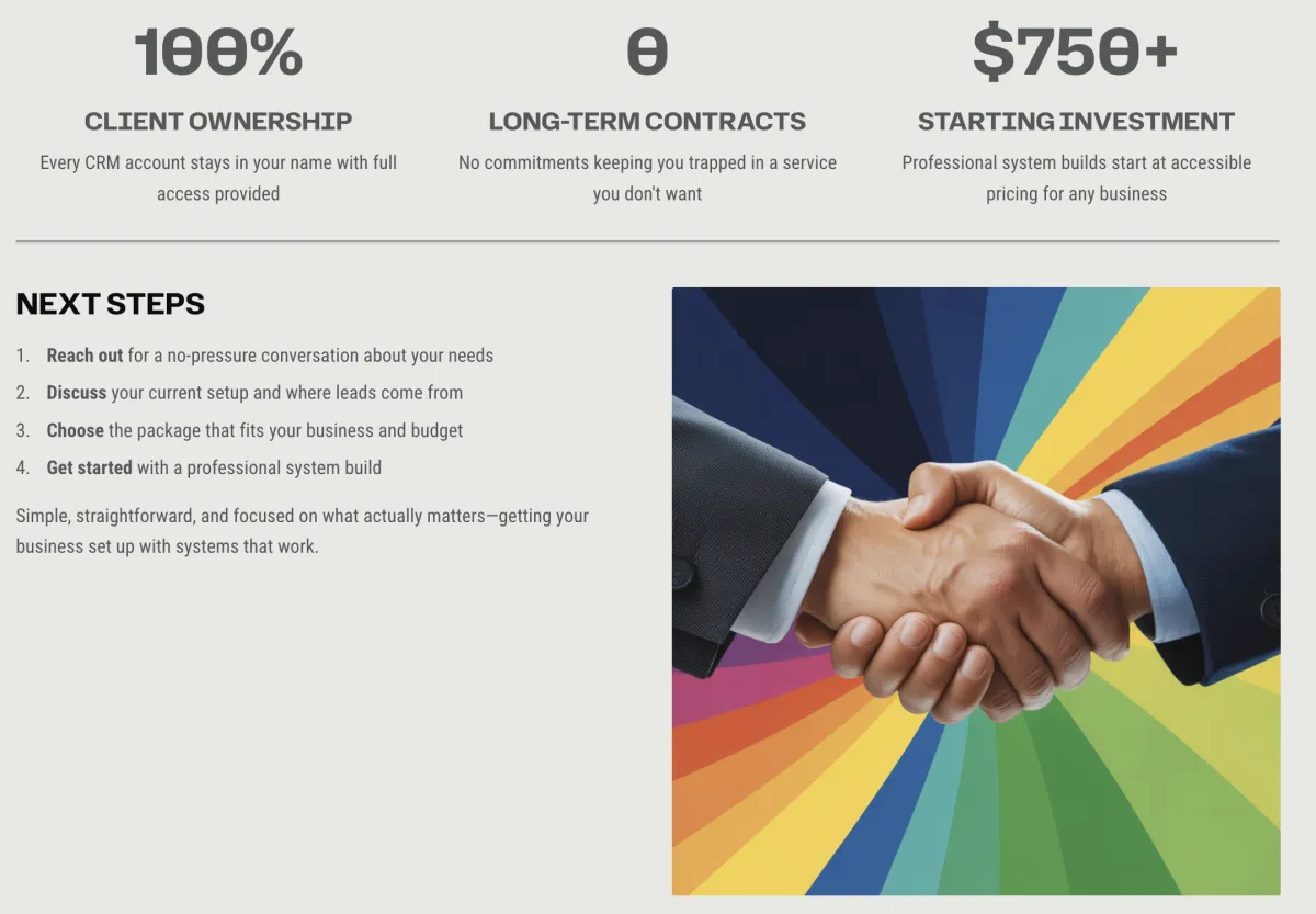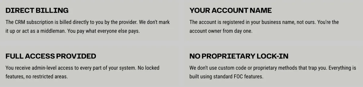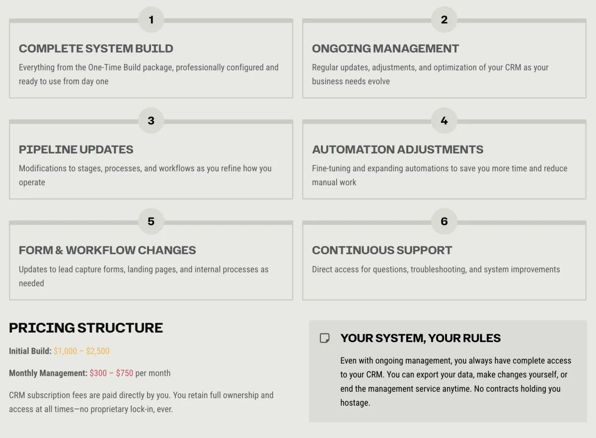 Many CRM providers build systems in their own name and rent access to you. If you stop paying them, you lose everything—your data, your automations, your entire system. That's not how we operate.