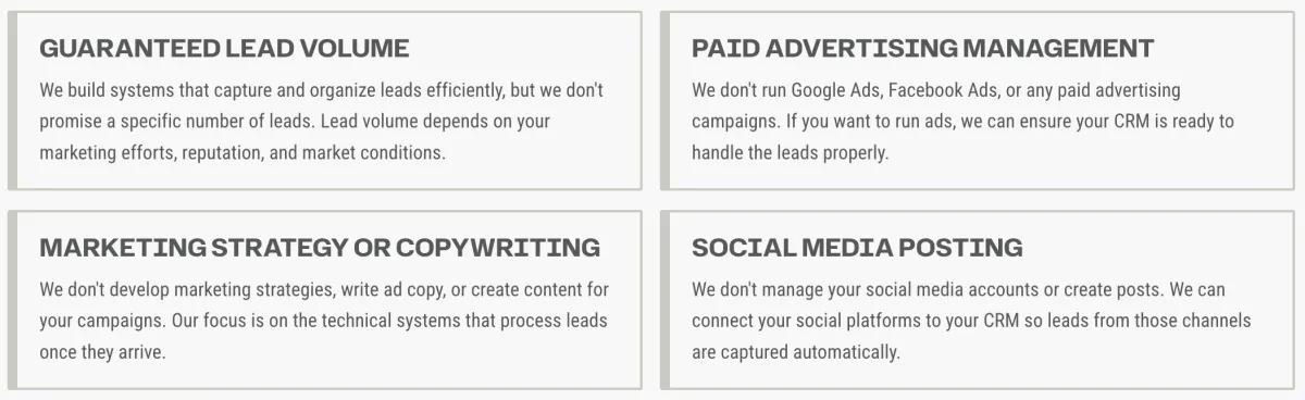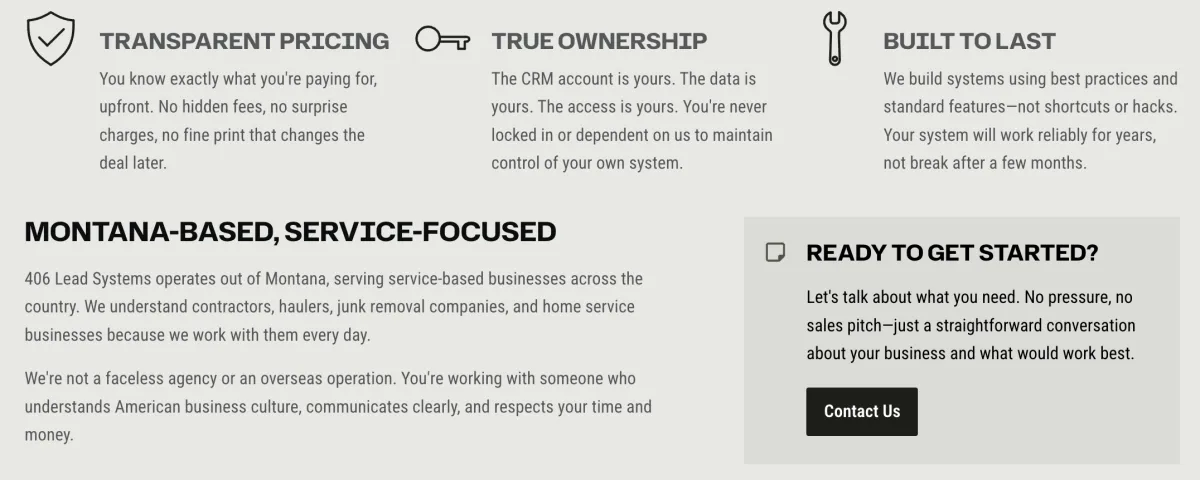 Whether you need a complete system build, CRM-only setup, or ongoing management, 406 Lead Systems delivers clean, functional solutions without the hype or pressure. Your business deserves systems that work—not promises that don't.